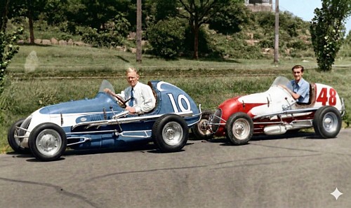 Sydney 1948 - 49 Speedway season - Frank Brewer (in 10) lands the two V860s #10 and # 48 from the USA. Andy McGavin in 48. Both cars went on to fabulous racing careers here, and both cars are still with us albeit in different restored forms. # 10 as the BIG BERCO #2 and # 48 as the Mackay Harvey #13.