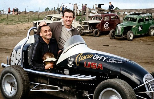 At 14 years of age my very good mate - the late David Johnsen sits on his idol's car. David grew up with Howard Revell and his Dad Ray and David was allowed to wash and clean the famous Offy - Australia # 1 - between meetings . Later David was a Pit Crew member for Howard. David drove the M & D Mtrs # 4 Holden at Westmead.