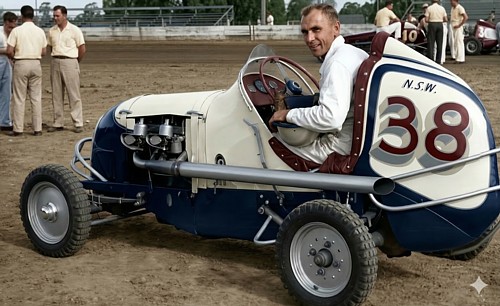 American Ace - Bob Tattersall here in the ex Ross Goonan NZ 4 midget - here as V860 USA 57 in South Australia during Bob's first ever visit to Australia in 1958.