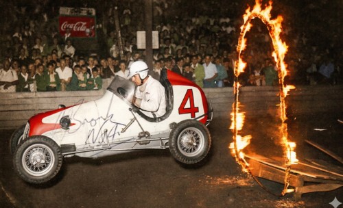 Len Brock in # 4 jumps the Ring of Fire - Cumberland Oval Parramatta.