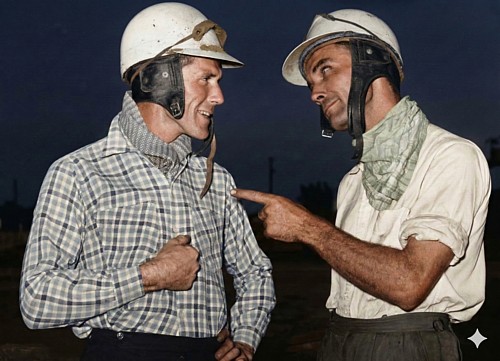 A posed publicity photo at the Sydney Sportsground Speedway 1950. # 20 Sel Payne - # 28 Jack Brabham - # 17 Bob Playfair.